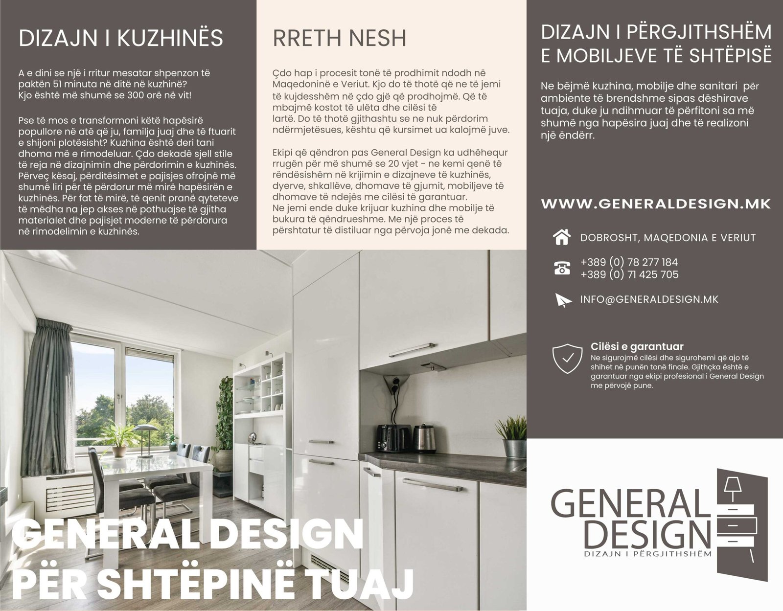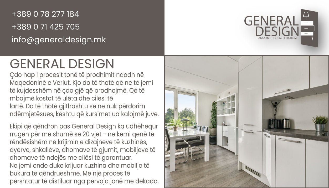 General Design е компанија од Северна Македонија. Таа е специјализирана за изработка на мебел за вашата дневна соба, спална соба, кујна и многу повеќе.